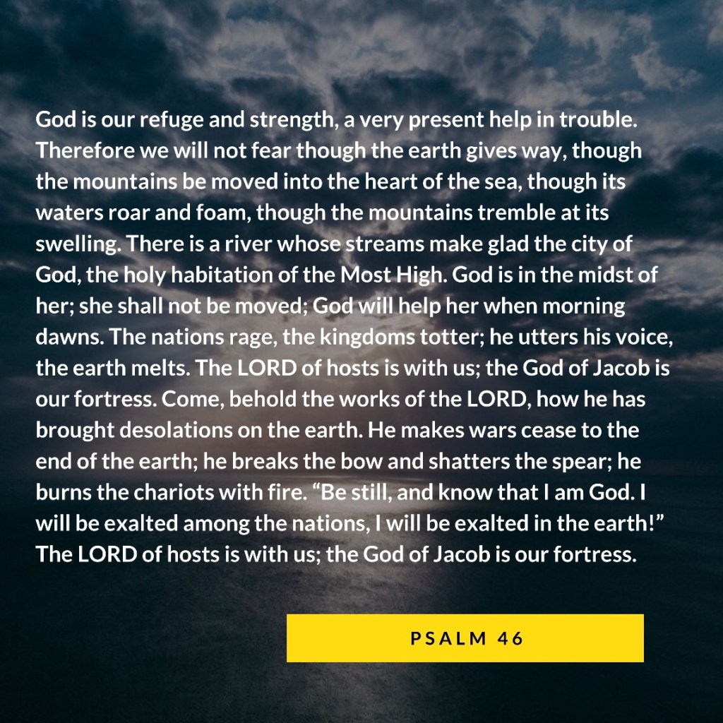 God is our refuge and strength, a very present help in trouble. Therefore we will not fear though the earth gives way, though the mountains be moved into the heart of the sea, though its waters roar and foam, though the mountains tremble at its swelling. There is a river whose streams make glad the city of God, the holy habitation of the Most High. God is in the midst of her; she shall not be moved; God will help her when morning dawns. The nations rage, the kingdoms totter; he utters his voice, the earth melts. The LORD of hosts is with us; the God of Jacob is our fortress. Come, behold the works of the LORD, how he has brought desolations on the earth. He makes wars cease to the end of the earth; he breaks the bow and shatters the spear; he burns the chariots with fire. “Be still, and know that I am God. I will be exalted among the nations, I will be exalted in the earth!” The LORD of hosts is with us; the God of Jacob is our fortress.